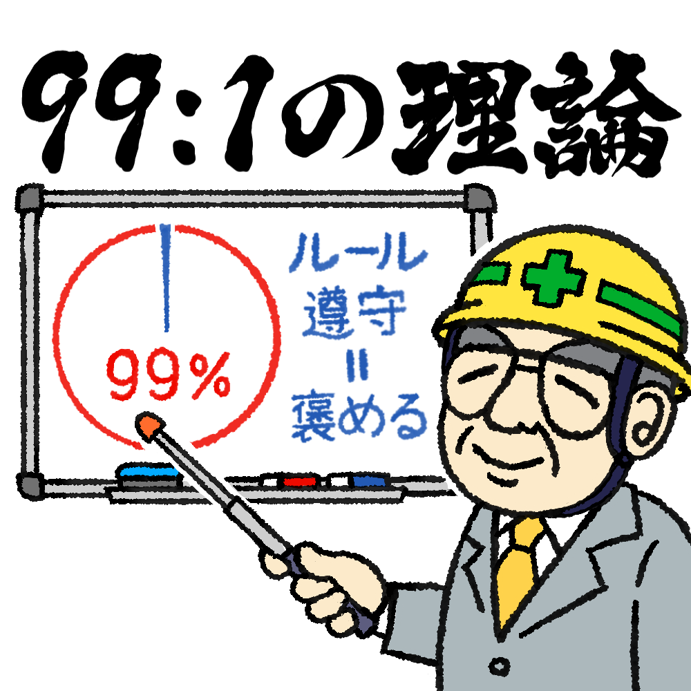 現場で働く人たちは、誰も災害・事故を起こそうなどとは思っていません。ルールを守り良い仕事をしたいと思っているはずです。しかし、作業環境や前提条件通りいかない場面は必ずあります。つまり、99%はルールを守っていても1%位は守れないケースが出てくるのが実態だと思います。皆さんが車の運転で制限スピードを100%守っていないことと同じです。その1%(実際はもっと確率は低いが分かり易さで表現している)を指摘するだけでは現場は腹落ちしないのです。まず良いところ(99%)を褒める(認める)事で自信をもってもらうこと、感謝の気持ちを表すことが最初になければ会話はスタートしません。